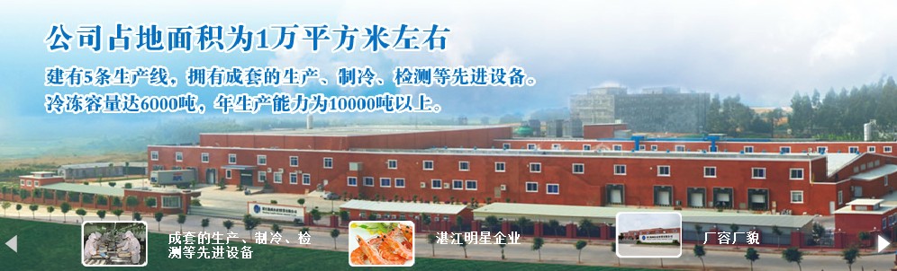 公司位于中國最南端的美麗的海濱城市湛江,交通運輸便捷,出口貿易地理位置得天獨厚。公司占地面積為8萬平方米左右,建有8條生產線,期中蝦生產線5條,羅非魚生產線3條,擁有成套的生產、制冷、檢測等先進設備。冷凍容量達6000噸,年生產能力為15000噸以上。